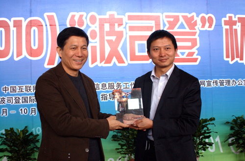 北京市互联网宣传管理办公室常务副主任佟力强为波司登公司代表颁发杰出贡献奖