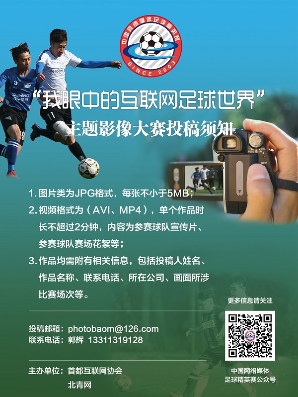 2、本次比赛只接受与“2017中国网络媒体足球精英赛”赛事有关的数码参赛作品,内容积健康向上,展现正能量。